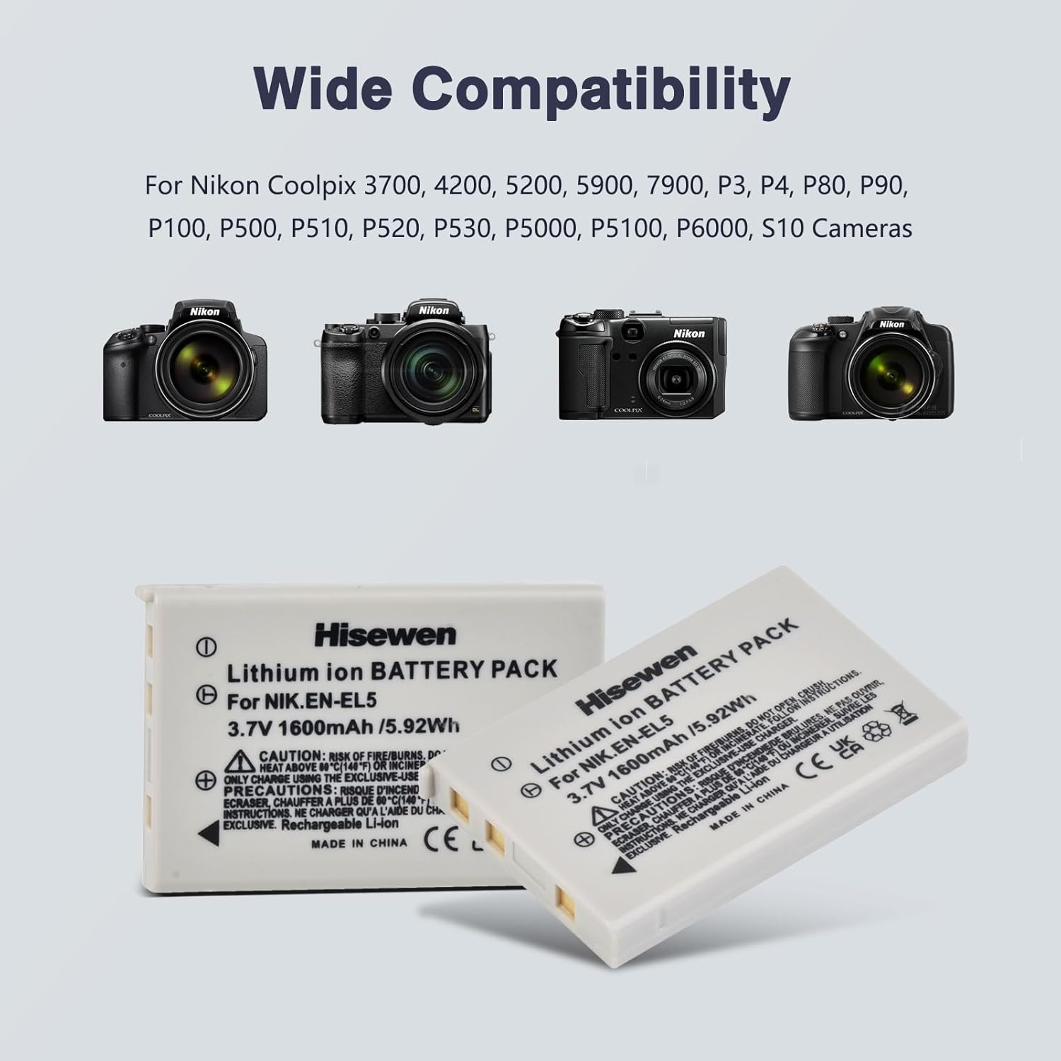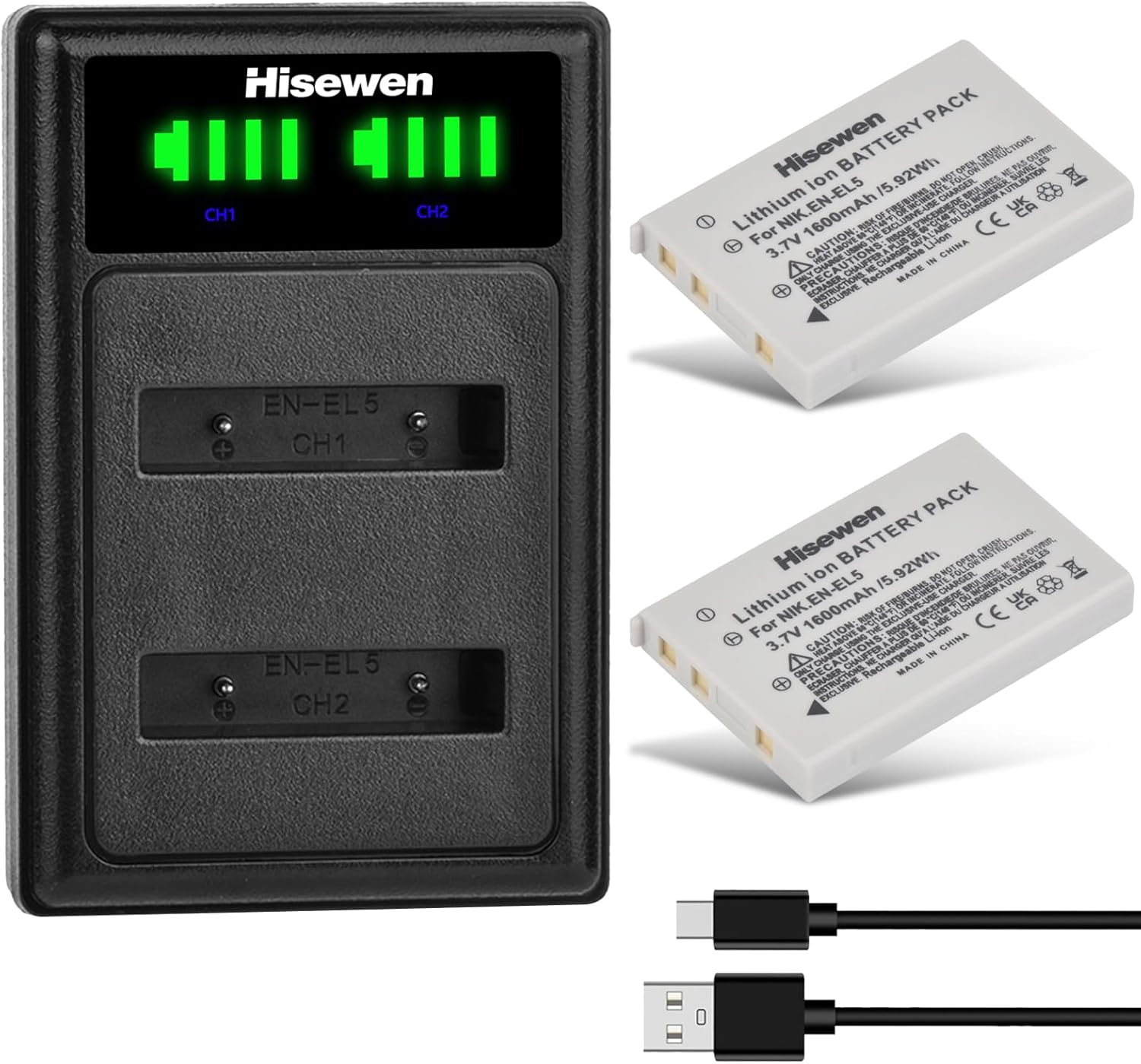 Este kit incluye 2 baterías EN-EL5 de 1600mAh junto con un cargador dual USB diseñado para cámaras Nikon Coolpix compatibles.