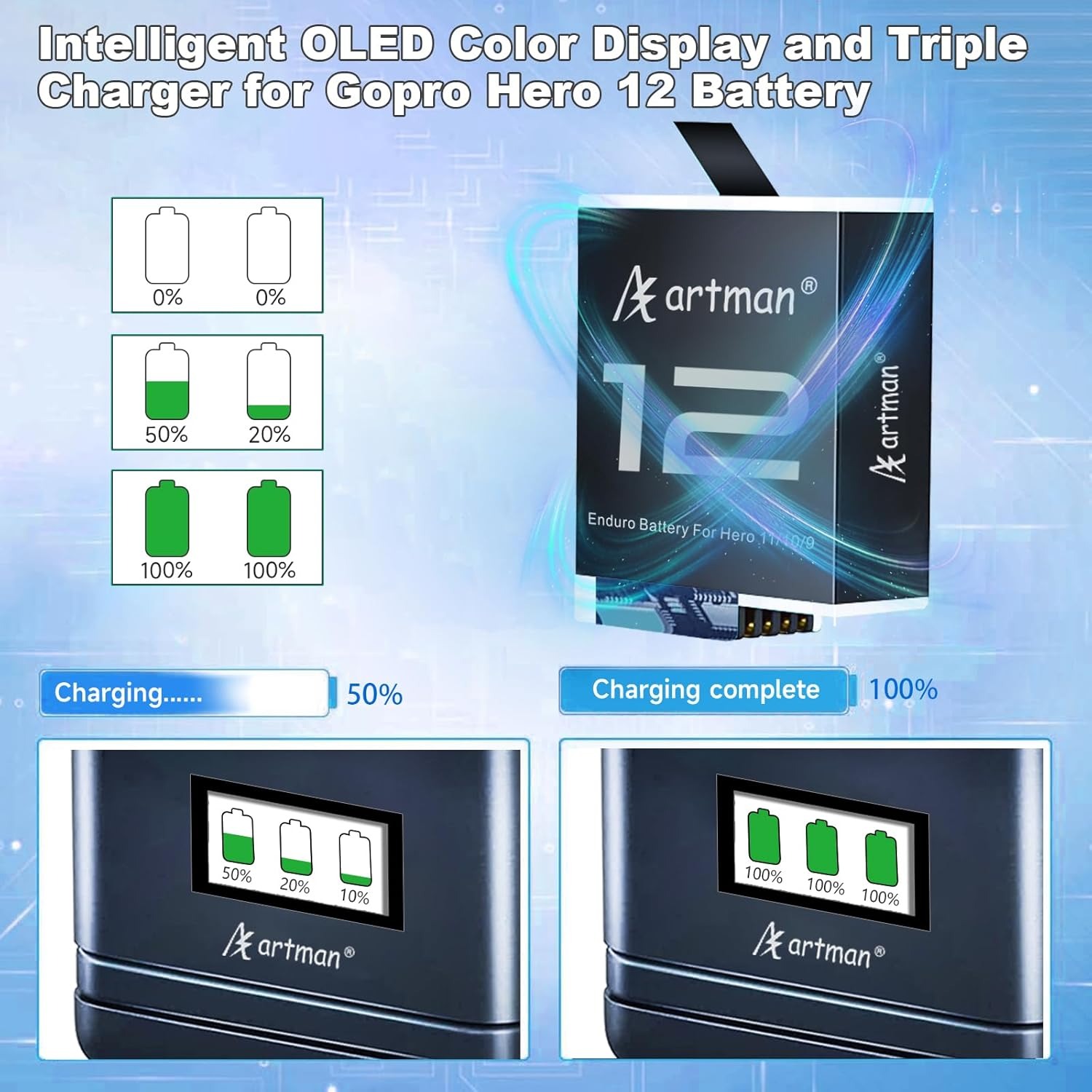 Este kit incluye 3 baterías compatibles para GoPro Hero 12, Hero 11, Hero 10 y Hero 9 Black, junto con un cargador inteligente USB de 3 canales.