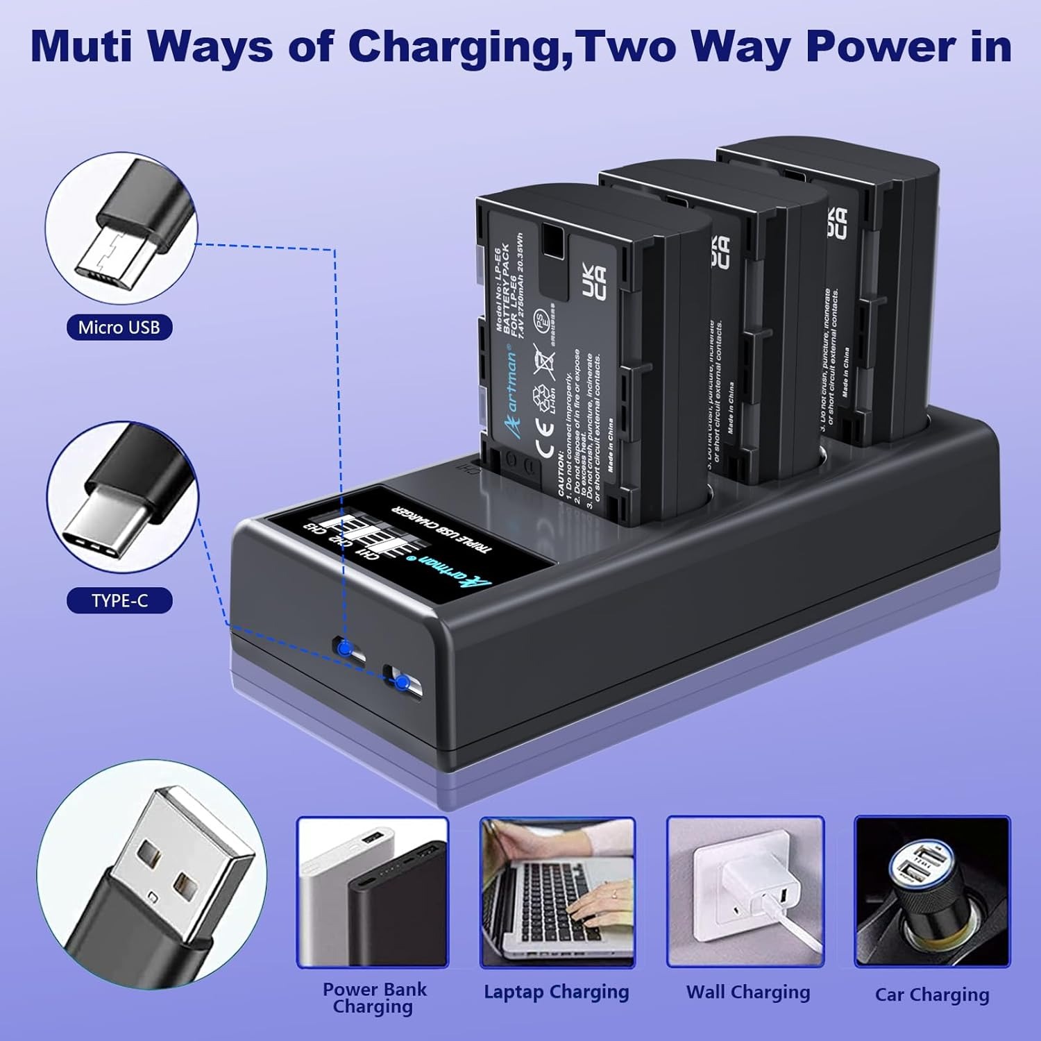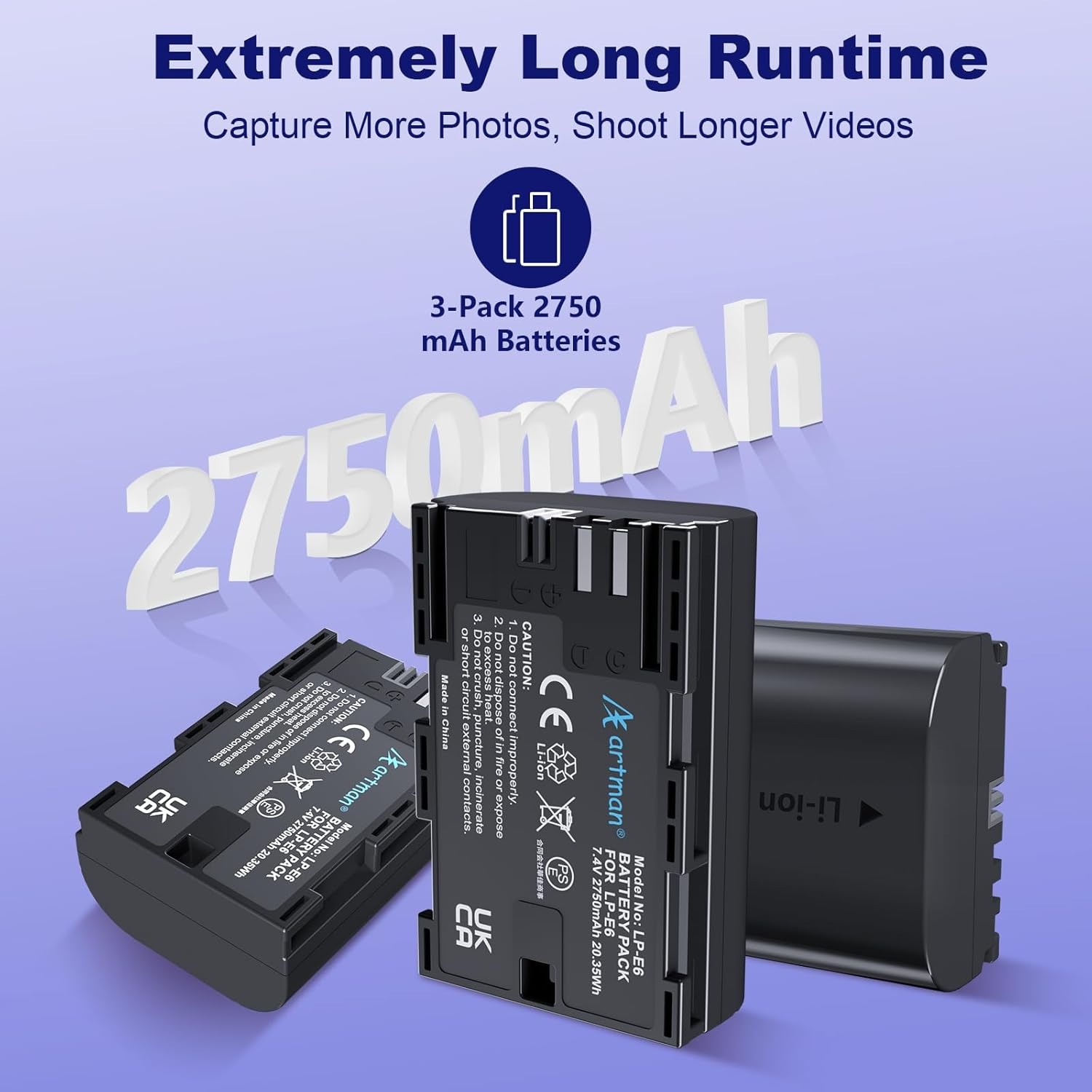 Este kit incluye 3 baterías LP-E6 / LP-E6N de 2750mAh junto con un cargador LCD de 3 ranuras, diseñado para cámaras Canon profesionales de la serie EOS R y DSLR.